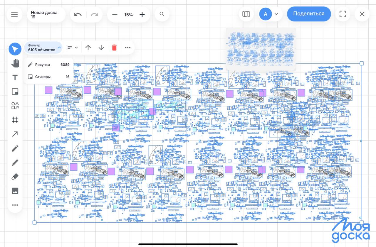 Теперь вы можете легко ориентироваться даже на самых больших досках! Чтобы увидеть миниатюры всех элементов вашей доски, просто нажмите кнопку мини-карты в верхнем правом углу.