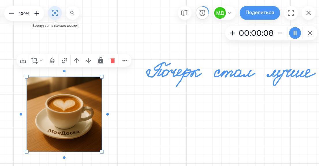 - Таймер — теперь Вы можете запускать и ставить на паузу таймер на доске, он сохраняется при перезагрузке доски, синхронизуется с участниками доски, а в конце оповещает Вас коротким звуковым сигналом!