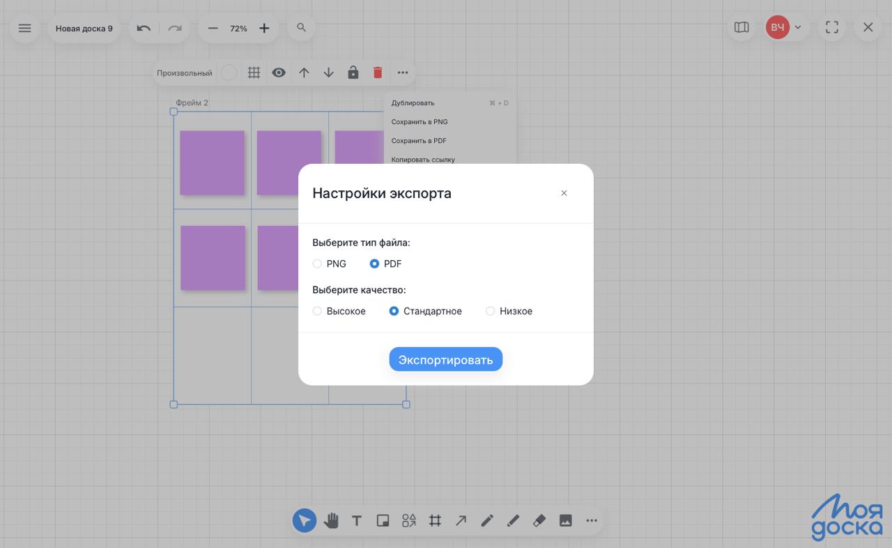 - Экспорт в PDF - теперь фреймы можно эскпортировать не только в PNG, но и в PDF в разном качестве