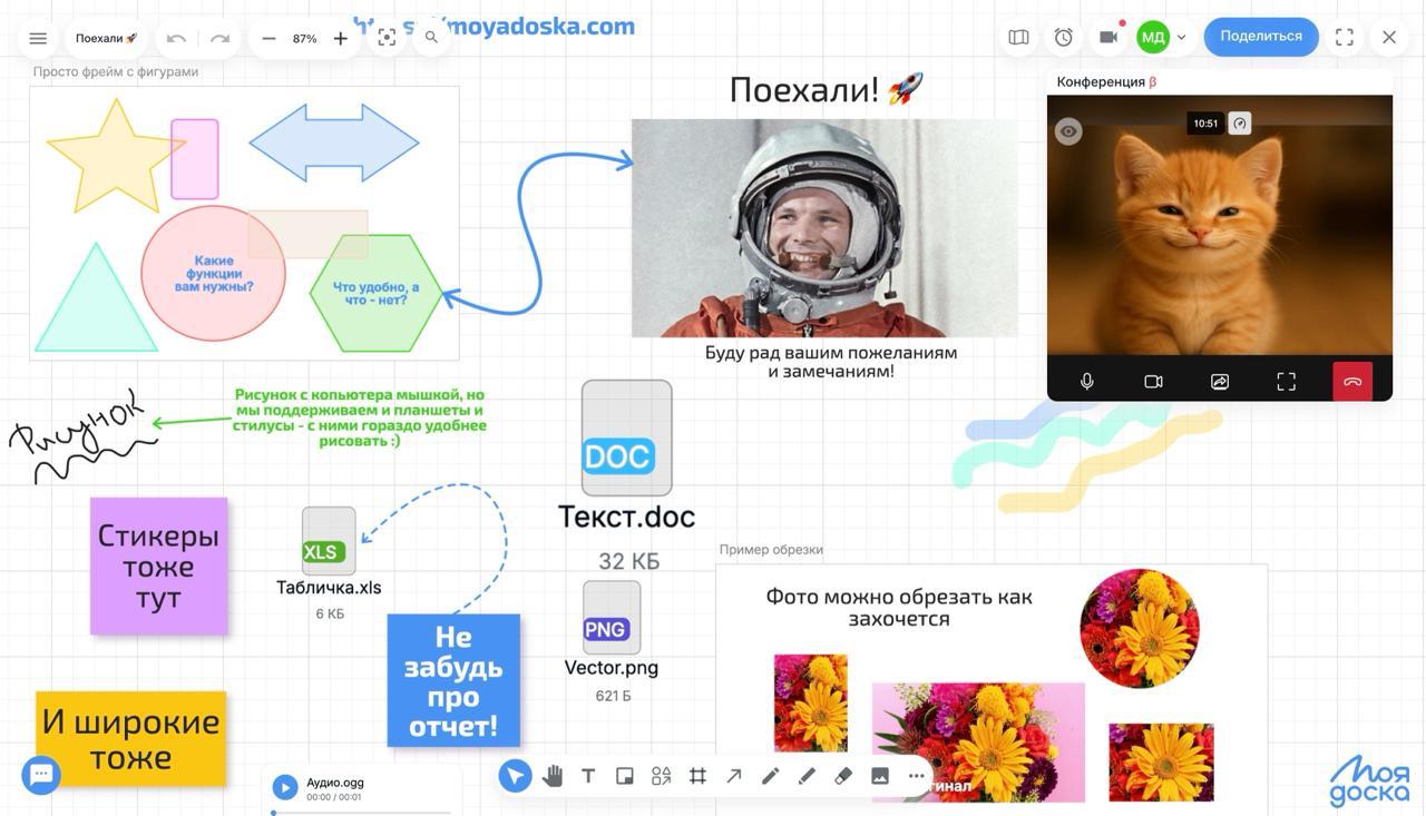 С сегодняшнего дня МояДоска предлагает вам новую крутую возможность — воспроизводить видео прямо на доске! Это дополнение к уже существующим функциям, таким как возможность обрезки фотографий, загрузка аудиофайлов, PDF-документов и возможность загружать файлы практически любого формата для скачивания.