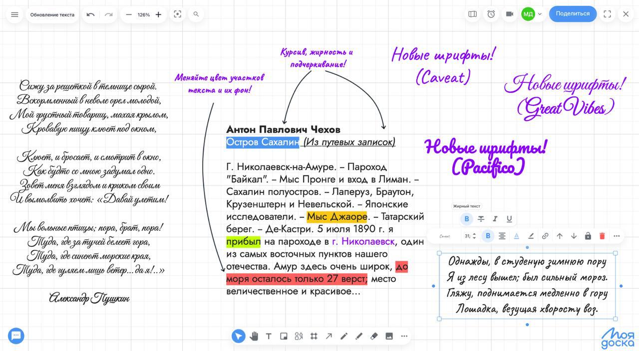 Все начинается с букв, рисунков, галочек, подчеркиваний... письмо - основной инструмент для всех досок. Был значительно переработан механизм письма и теперь на всех (новых, которые сейчас создадите) досках почерк станет более гладким и плавным, а сама отрисовка этих элементов быстрее и производительнее - теперь тысячи рисунков не создают особого труда для доски.